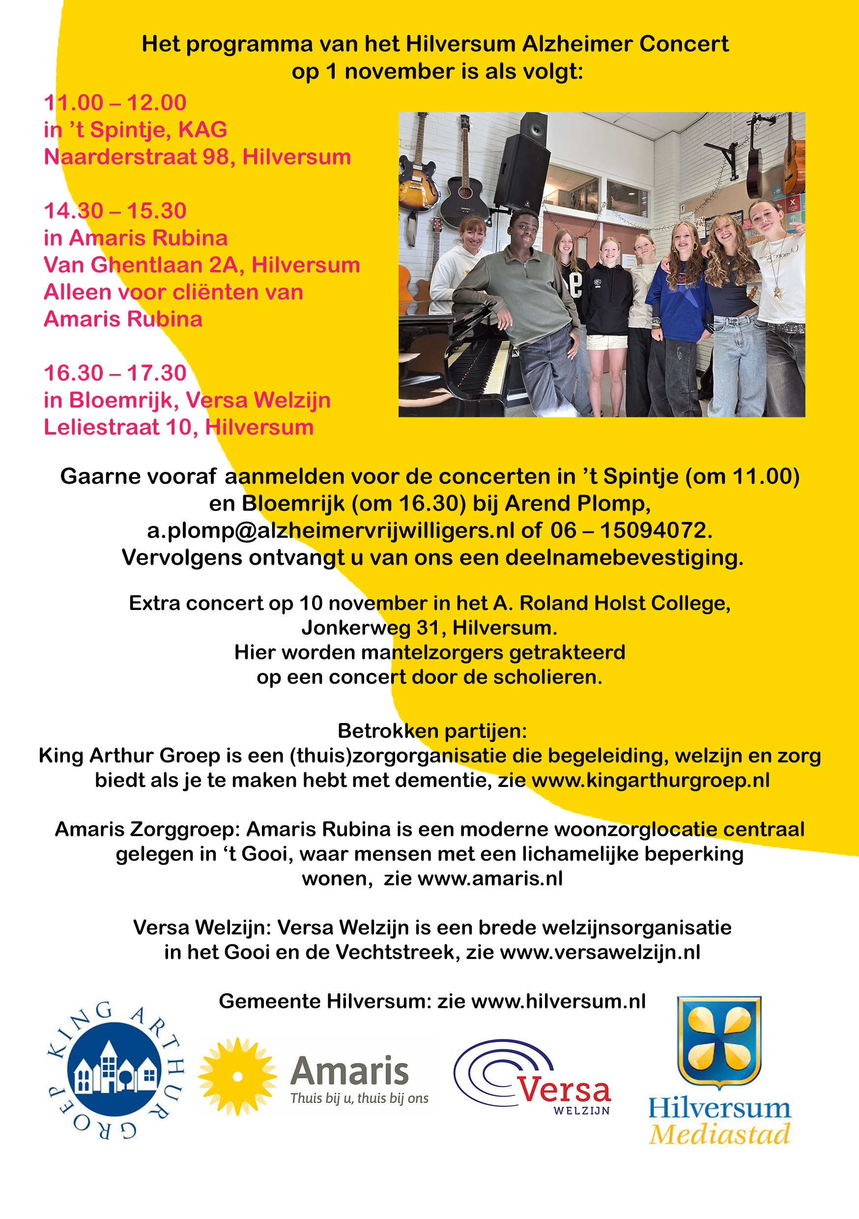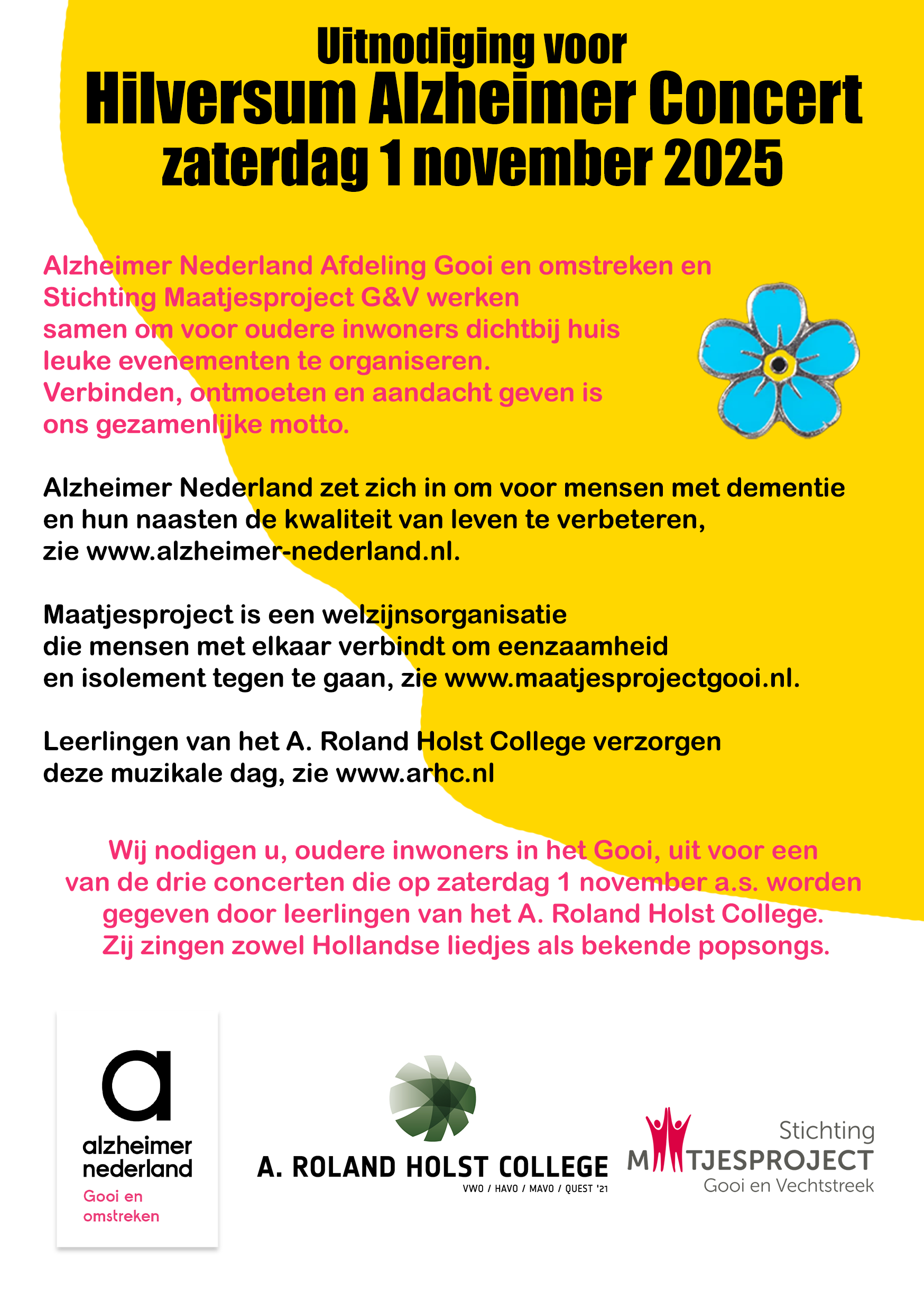 Alzheimer Nederland afdeling Gooi en omstreken en Stichting Maatjesproject G&V organiseren op 1 november het Hilversum Alzheimer Concert. Deze muzikale dag wordt verzorgd door leerlingen van het Roland Rhapsody koor van onze school. Oudere inwoners van t Gooi zijn uitgenodigd voor een van de 3 concerten die op deze dag worden gegeven.